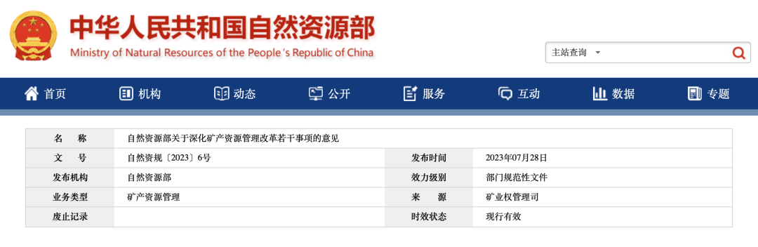 7月26日,自然資源部發布《關于深化礦產資源管理改革若干事項的意見》提出,為貫徹落實黨中央、國務院關于礦業權出讓制度改革、石油天然氣體制改革、加強重要能源礦產資源國內勘探開發和增儲上產等決策部署,充分發揮市場在資源配置中的決定性作用,更好發揮政府作用,深化“放管服”改革,嚴守資源安全底線、優化國土空間格局、促進綠色低碳發展、維護資源資產權益,就深化礦產資源管理改革提出十一點意見。主要包括:全面推進礦業權競爭性出讓、嚴格控制礦業權協議出讓、積極推進“凈礦”出讓、實行同一礦種探礦權采礦權出讓登記同級管理、開放油氣勘查開采市場、實行油氣探采合一制度、調整探礦權期限、執行新的礦產資源儲量分類、強化礦產資源儲量評審備案、明確評審備案范圍和權限、規范財政出資地質勘查工作。