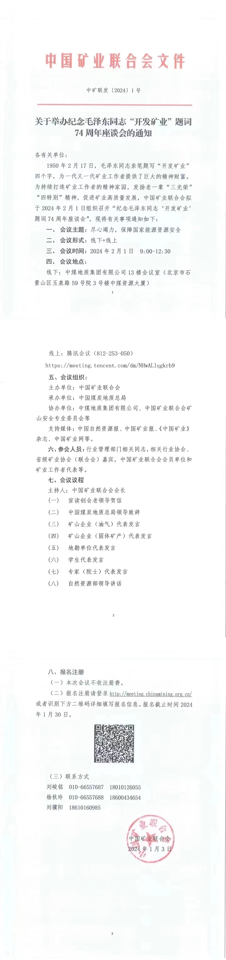中國礦業聯合會:關于舉辦紀念毛澤東同志“開發礦業”題詞74周年座談會的通知